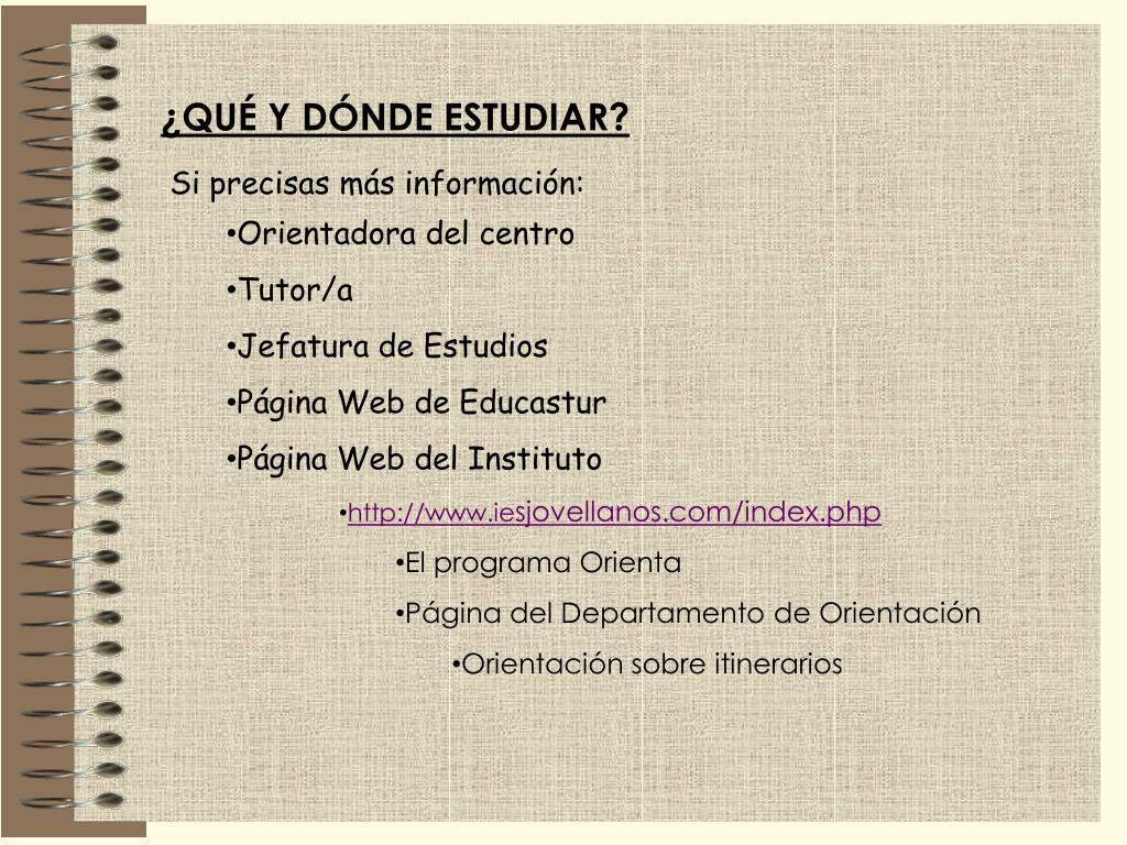 ¿QUÉ Y DÓNDE ESTUDIAR? • Si precisas más información: • Orientadora del centro • Tutor/a • Jefatura de Estudios • Página Web de Educastur • Página Web del Instituto • http://www.iesjovellanos.com/index.php • El programa Orienta • Página del Departamento de Orientación • Orientación sobre itinerarios