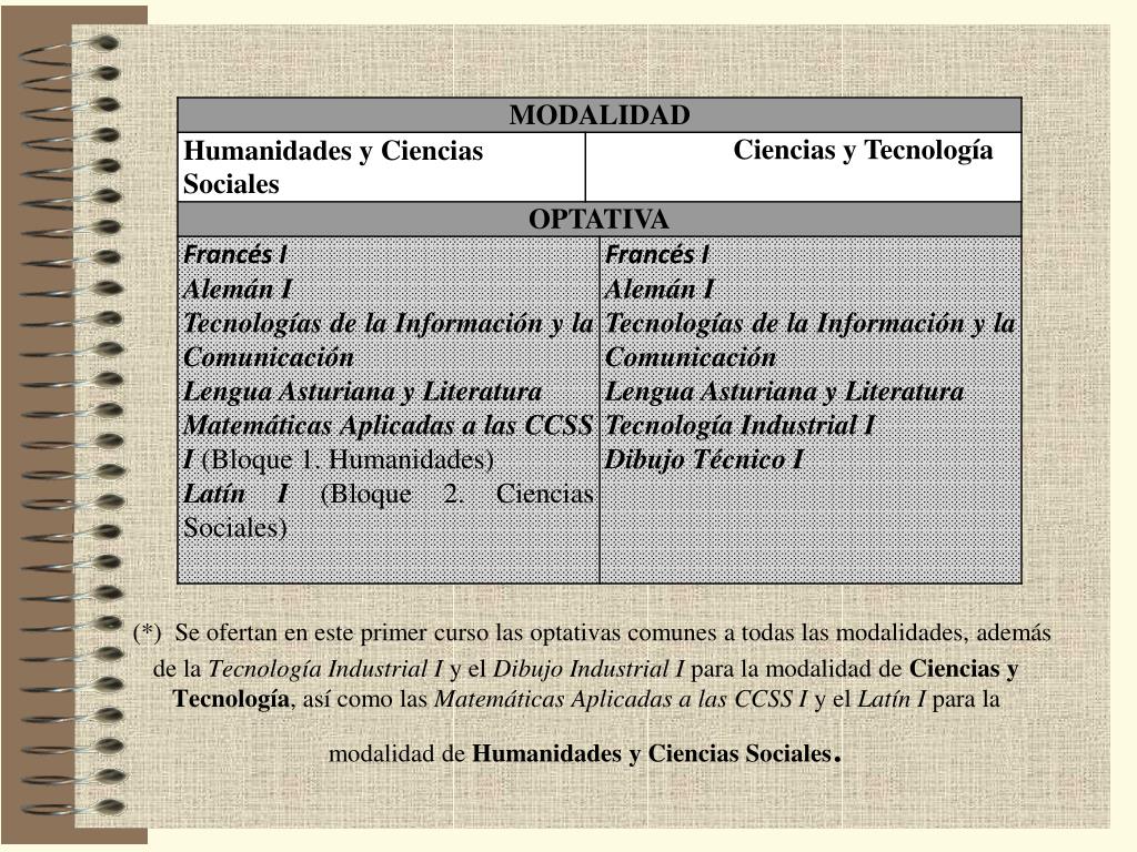 (*) Se ofertan en este primer curso las optativas comunes a todas las modalidades, además de la Tecnología Industrial I y el Dibujo Industrial I para la modalidad de Ciencias y Tecnología, así como las Matemáticas Aplicadas a las CCSS I y el Latín I para la modalidad de Humanidades y Ciencias Sociales.
