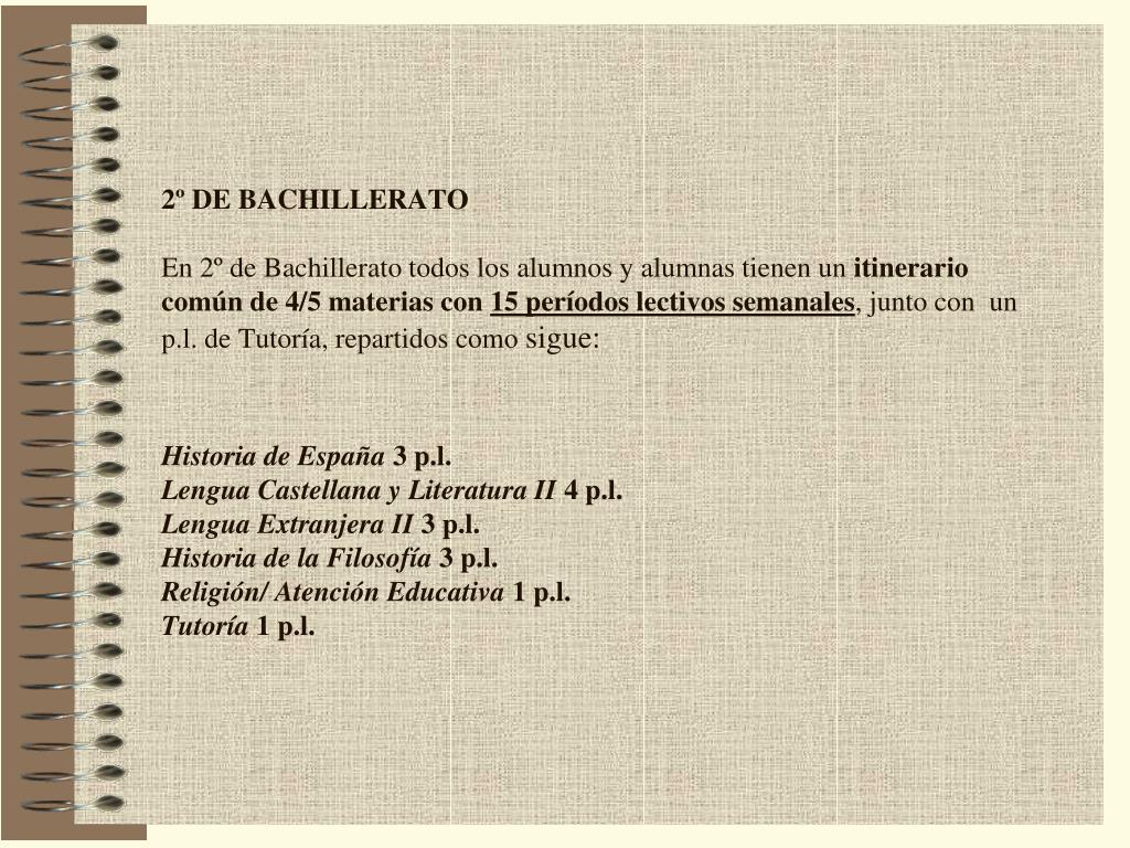 2º DE BACHILLERATOEn 2º de Bachillerato todos los alumnos y alumnas tienen un itinerario común de 4/5 materias con 15 períodos lectivos semanales, junto con un p.l. de Tutoría, repartidos como sigue:Historia de España3 p.l.Lengua Castellana y Literatura II4 p.l.Lengua Extranjera II3 p.l.Historia de la Filosofía3 p.l.Religión/ Atención Educativa 1 p.l.Tutoría1 p.l.