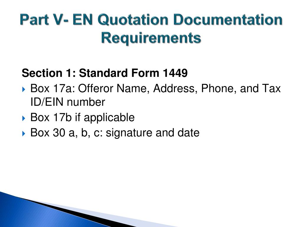 Part V- EN Quotation Documentation Requirements Section 1: Standard Form 1449 • Box 17a: Offeror Name, Address, Phone, and Tax ID/EIN number • Box 17b if applicable • Box 30 a, b, c: signature and date