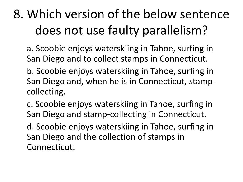 8. Which version of the below sentence does not use faulty parallelism? a. Scoobieenjoys waterskiing in Tahoe, surfing in San Diego and to collect stamps in Connecticut. b. Scoobieenjoys waterskiing in Tahoe, surfing in San Diego and, when he is in Connecticut, stamp-collecting. c. Scoobieenjoys waterskiing in Tahoe, surfing in San Diego and stamp-collecting in Connecticut. d. Scoobieenjoys waterskiing in Tahoe, surfing in San Diego and the collection of stamps in Connecticut.