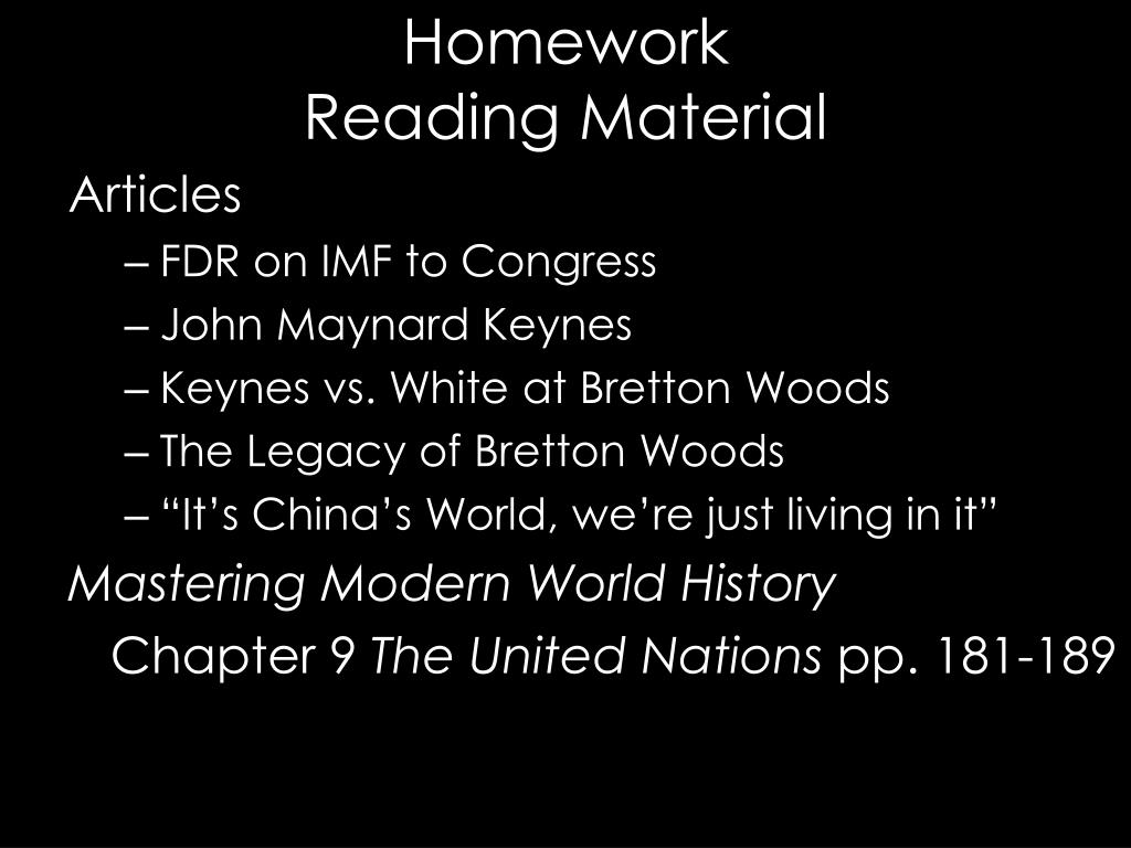 HomeworkReading Material Articles • FDR on IMF to Congress • John Maynard Keynes • Keynes vs. White at Bretton Woods • The Legacy of Bretton Woods • “It’s China’s World, we’re just living in it” Mastering Modern World History Chapter 9 The United Nations pp. 181-189