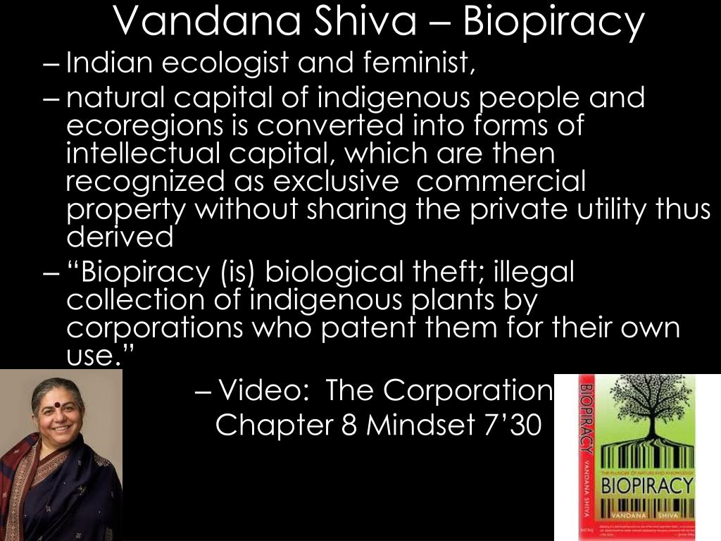 Vandana Shiva – Biopiracy • Indian ecologist and feminist, • natural capital of indigenous people and ecoregions is converted into forms of intellectual capital, which are then recognized as exclusive commercial property without sharing the private utility thus derived • “Biopiracy (is) biological theft; illegal collection of indigenous plants by corporations who patent them for their own use.” • Video: The Corporation: Chapter 8 Mindset 7’30