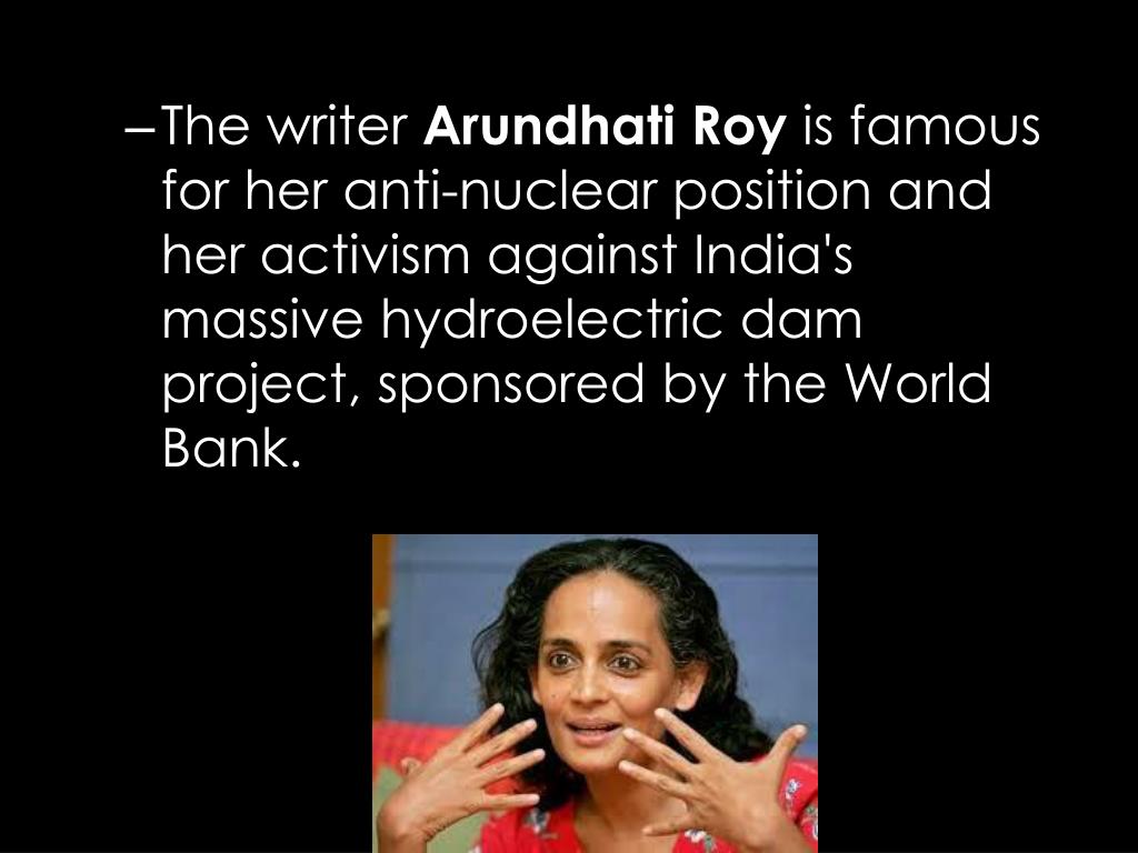 The writer Arundhati Roy is famous for her anti-nuclear position and her activism against India's massive hydroelectric dam project, sponsored by the World Bank.