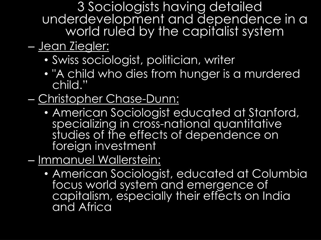 3 Sociologists having detailed underdevelopment and dependence in a world ruled by the capitalist system • Jean Ziegler: • Swiss sociologist, politician, writer • "A child who dies from hunger is a murdered child.” • Christopher Chase-Dunn: • American Sociologist educated at Stanford, specializing in cross-national quantitative studies of the effects of dependence on foreign investment • Immanuel Wallerstein: • American Sociologist, educated at Columbia focus world system and emergence of capitalism, especially their effects on India and Africa