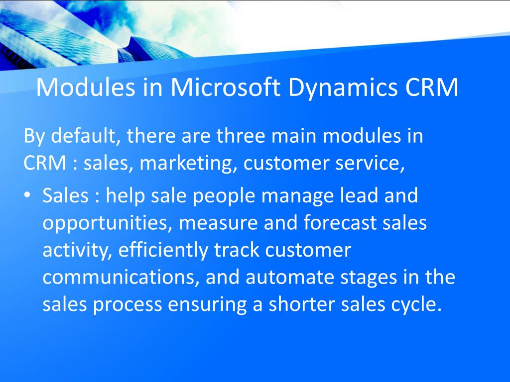 Modules in Microsoft Dynamics CRM By default, there are three main modules in CRM : sales, marketing, customer service, • Sales : help sale people manage lead and opportunities, measure and forecast sales activity, efficiently track customer communications, and automate stages in the sales process ensuring a shorter sales cycle.