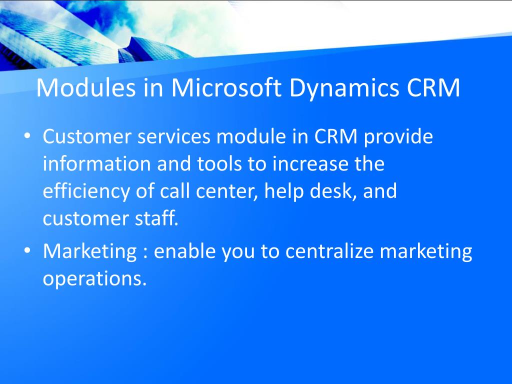 Modules in Microsoft Dynamics CRM • Customer services module in CRM provide information and tools to increase the efficiency of call center, help desk, and customer staff. • Marketing : enable you to centralize marketing operations.