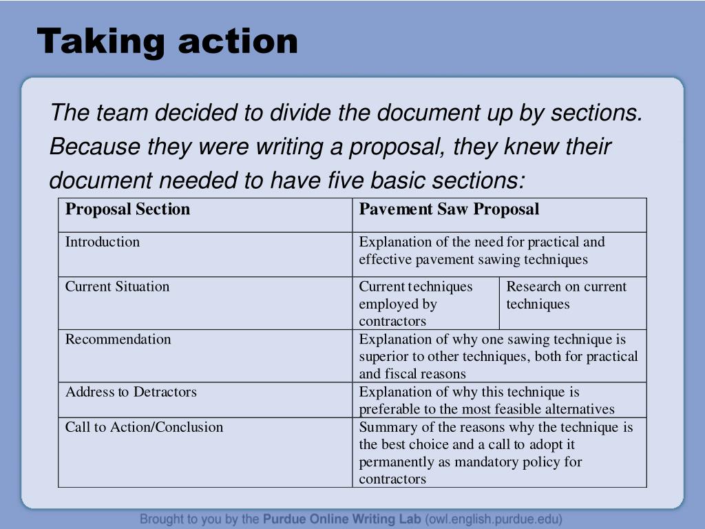 Taking action The team decided to divide the document up by sections. Because they were writing a proposal, they knew their document needed to have five basic sections: