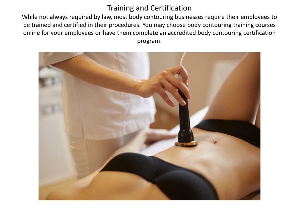 Training and CertificationWhile not always required by law, most body contouring businesses require their employees to be trained and certified in their procedures. You may choose body contouring training courses online for your employees or have them complete an accredited body contouring certification program.