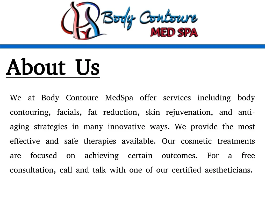 About Us We at Body Contoure MedSpa offer services including body contouring, facials, fat reduction, skin rejuvenation, and anti-aging strategies in many innovative ways. We provide the most effective and safe therapies available. Our cosmetic treatments are focused on achieving certain outcomes. For a free consultation, call and talk with one of our certified aestheticians.