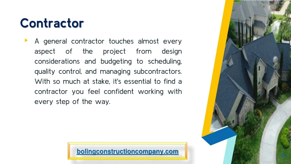 Contractor ▸ A general contractor touches almost every aspect of the considerations and budgeting to scheduling, quality control, and managing subcontractors. With so much at stake, it's essential to find a contractor you feel confident working with every step of the way. project from design bolingconstructioncompany.com 4