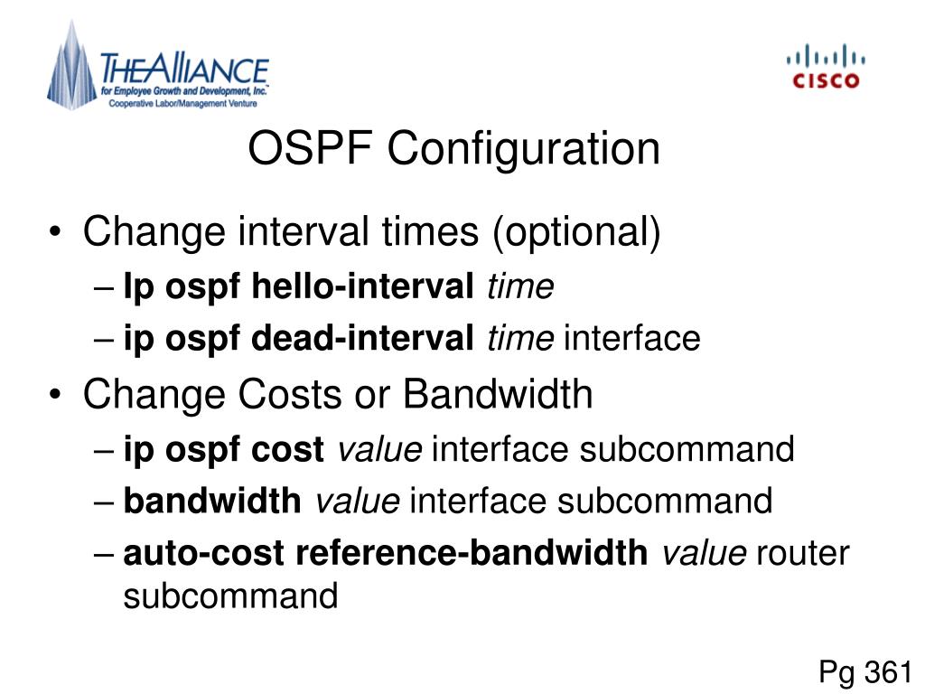 OSPF Configuration • Change interval times (optional) • Ip ospf hello-interval time • ip ospf dead-interval time interface • Change Costs or Bandwidth • ip ospf cost value interface subcommand • bandwidth value interface subcommand • auto-cost reference-bandwidth value router subcommand Pg 361