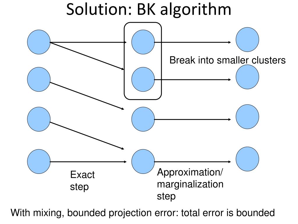 Solution: BK algorithm Break into smaller clusters Approximation/ marginalization step Exact step With mixing, bounded projection error: total error is bounded