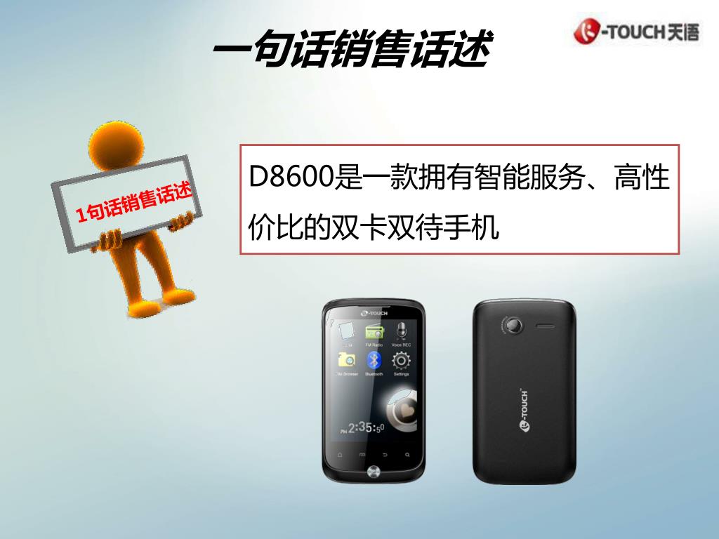 一句话销售话述 1句话销售话述 D8600是一款拥有智能服务、高性价比的双卡双待手机
