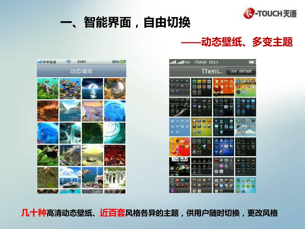 一、智能界面,自由切换 ——动态壁纸、多变主题 几十种高清动态壁纸、近百套风格各异的主题,供用户随时切换,更改风格