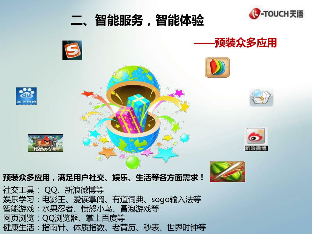 二、智能服务,智能体验 ——预装众多应用 预装众多应用,满足用户社交、娱乐、生活等各方面需求! 社交工具: QQ、新浪微博等 娱乐学习:电影王、爱读掌阅、有道词典、sogo输入法等 智能游戏:水果忍者、愤怒小鸟、冒泡游戏等 网页浏览:QQ浏览器、掌上百度等 健康生活:指南针、体质指数、老黄历、秒表、世界时钟等