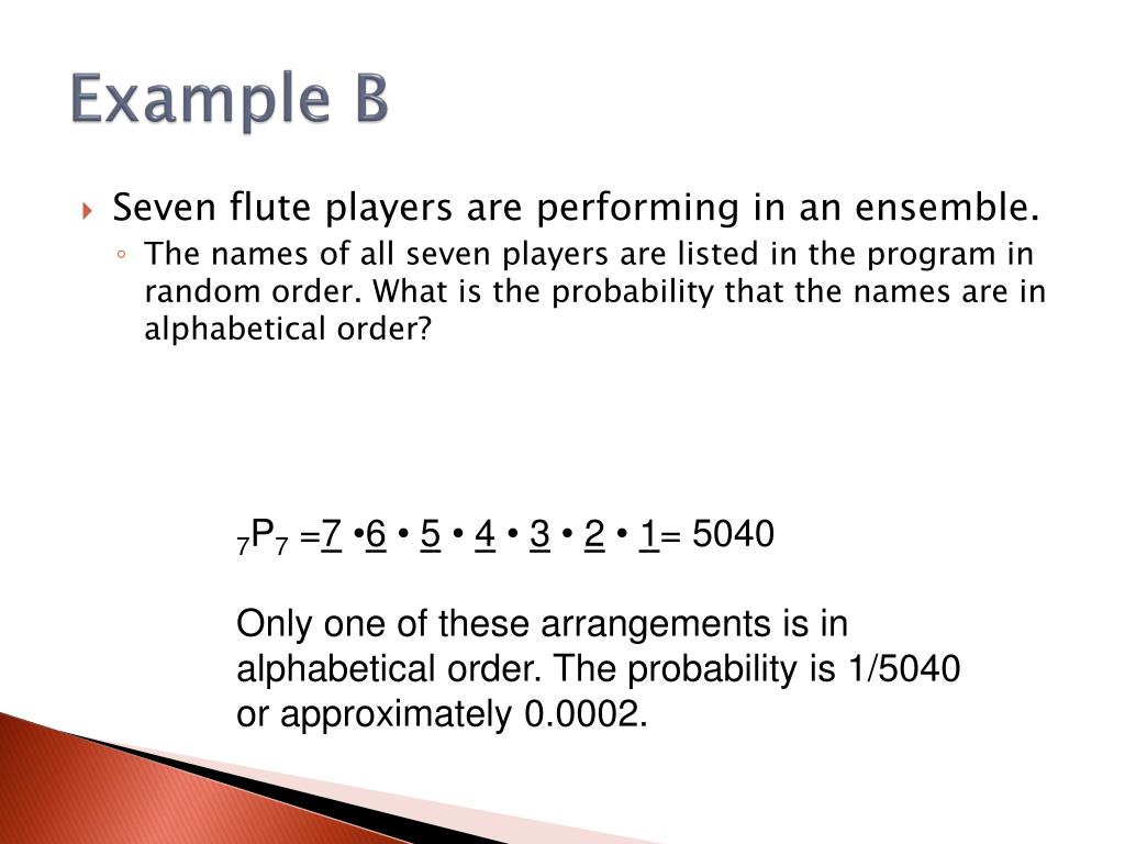 Example B • Seven flute players are performing in an ensemble. • The names of all seven players are listed in the program in random order. What is the probability that the names are in alphabetical order? 7P7 =7 •6 • 5 • 4 • 3 • 2 • 1= 5040 Only one of these arrangements is in alphabetical order. The probability is 1/5040 or approximately 0.0002.