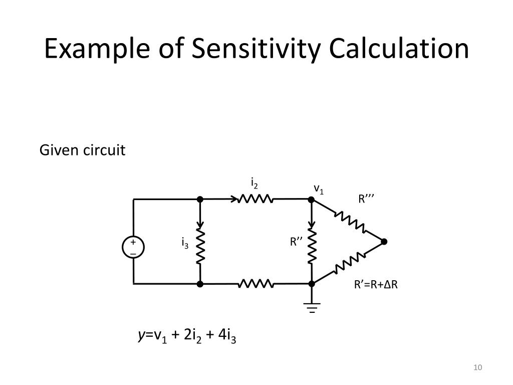 Example of Sensitivity Calculation Given circuit i2 v1 R’’’ i3 R’’ + _ R’=R+∆R y=v1 + 2i2 + 4i3