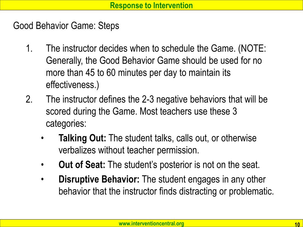 Sample Classroom Management Strategy: Good Behavior Game(Barrish, Saunders, & Wold, 1969) The Good Behavior Game is a whole-class intervention to improve student attending and academic engagement. Description: The class is divided into two or more student teams. The teacher defines a small set of 2 to 3 negative behaviors. When a student shows a problem behavior, the teacher assigns a negative behavior ‘point’ to that student’s team. At the end of the Game time period, any team whose number of points falls below a ‘cut-off’ set by the teacher earns a daily reward or privilege. Guidelines for using this intervention: The Game is ideal to use with the entire class during academic study or lecture periods to keep students academically engaged The Game is not suitable for less-structured activities such as cooperative learning groups, where students are expected to interact with each other as part of the work assignment.