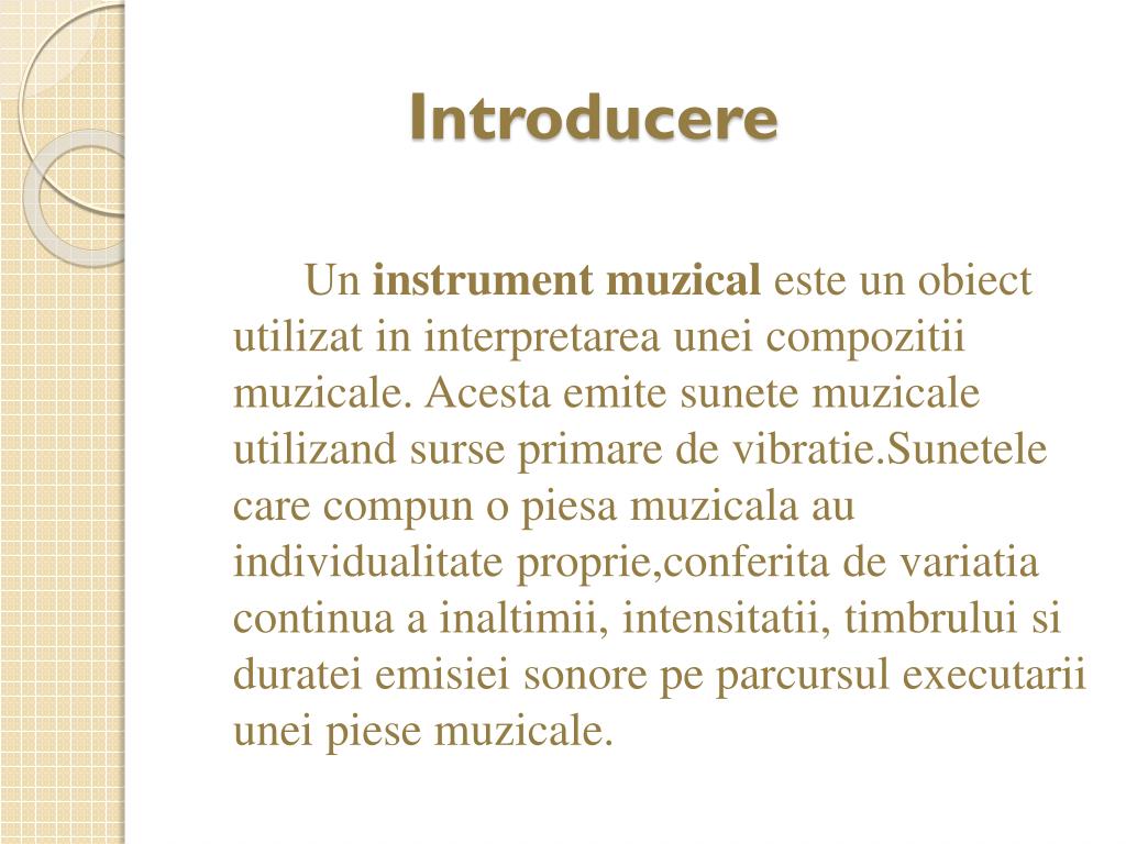 Introducere Un instrument muzicaleste un obiectutilizatin interpretareauneicompozitii muzicale.Acestaemitesunetemuzicaleutilizandsurseprimare de vibratie.Sunetele care compun o piesamuzicala au individualitateproprie,conferita de variatia continua a inaltimii,intensitatii,timbruluisidurateiemisieisonorepeparcursulexecutariiuneipiesemuzicale.