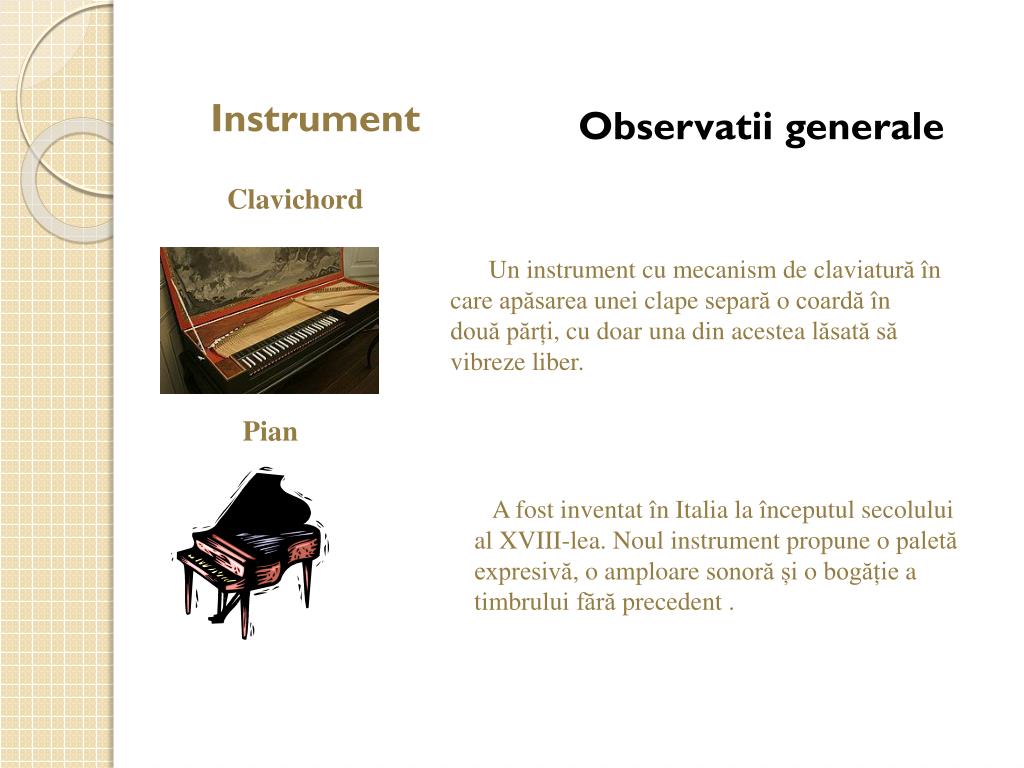 Instrument Observatii generale Clavichord Un instrument cu mecanism de claviaturăîn care apăsareauneiclapesepară o coardăîndouăpărți, cu doaruna din acestealăsatăsăvibrezeliber. Pian A fostinventatîn Italia la începutulsecolului al XVIII-lea. Noul instrument propune o paletăexpresivă, o amploaresonorăși o bogăție a timbruluifără precedent .
