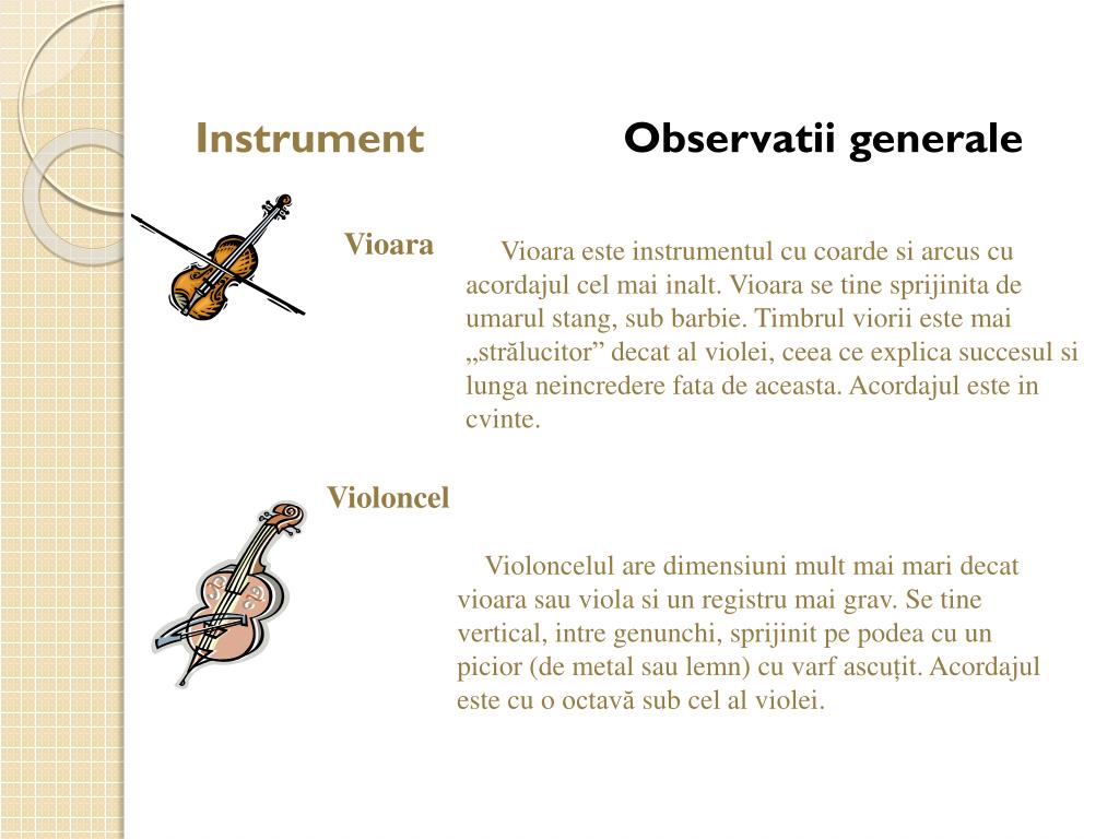 Instrument Observatii generale Vioara Vioaraesteinstrumentul cu coardesiarcus cu acordajulcelmaiinalt. Vioara se tinesprijinita de umarulstang, sub barbie.Timbrulvioriiestemai „strălucitor” decat al violei, ceeaceexplicasuccesulsilunga neincrederefata de aceasta. Acordajulestein cvinte. Violoncel Violoncelul are dimensiunimultmaimaridecat vioarasau viola si un registrumaigrav. Se tine vertical, intregenunchi, sprijinitpepodea cu un picior (de metal saulemn) cu varfascuțit. Acordajuleste cu o octavă sub cel al violei.