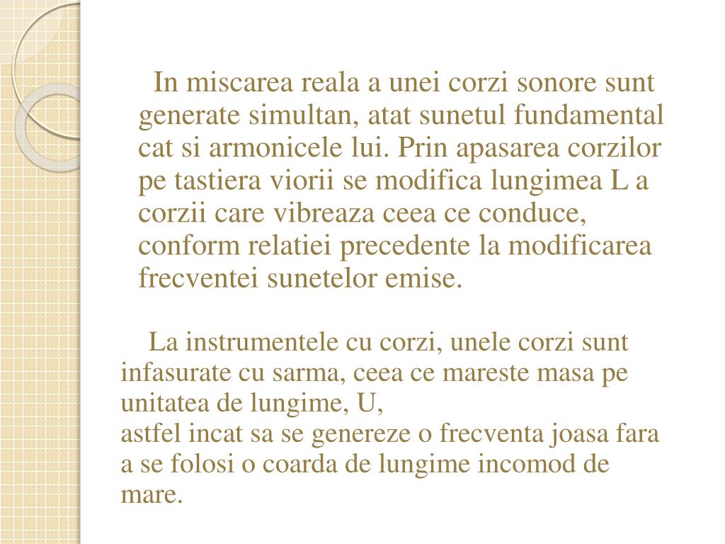 In miscarea reala a unei corzi sonore sunt generate simultan, atat sunetul fundamental cat si armonicele lui. Prin apasarea corzilor pe tastiera viorii se modifica lungimea L a corzii care vibreaza ceea ce conduce, conform relatiei precedente la modificarea frecventei sunetelor emise. La instrumentele cu corzi, unele corzi sunt infasurate cu sarma, ceea ce mareste masa pe unitatea de lungime, U, astfel incat sa se genereze o frecventa joasa fara a se folosi o coarda de lungime incomod de mare.