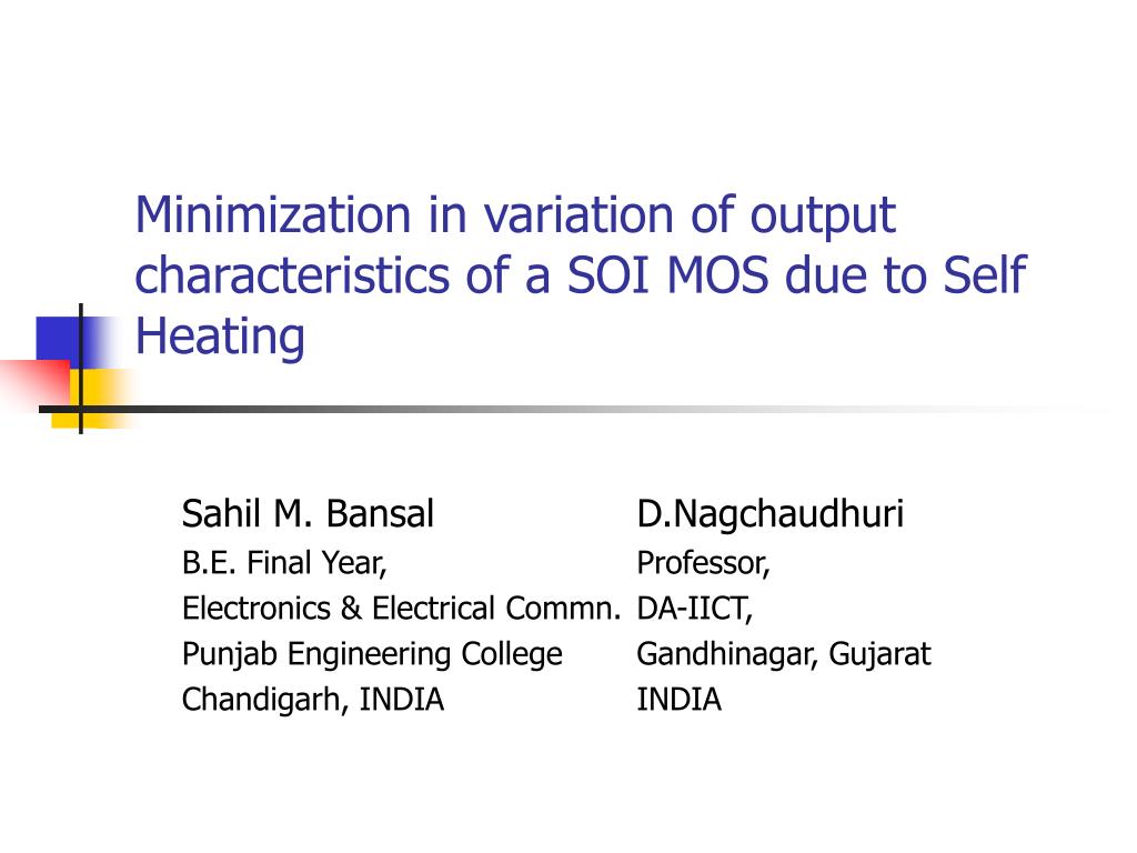 Minimization in variation of output characteristics of a SOI MOS due to Self Heating Sahil M. Bansal D.Nagchaudhuri B.E. Final Year, Professor, Electronics & Electrical Commn. DA-IICT, Punjab Engineering College Gandhinagar, Gujarat Chandigarh, INDIA INDIA
