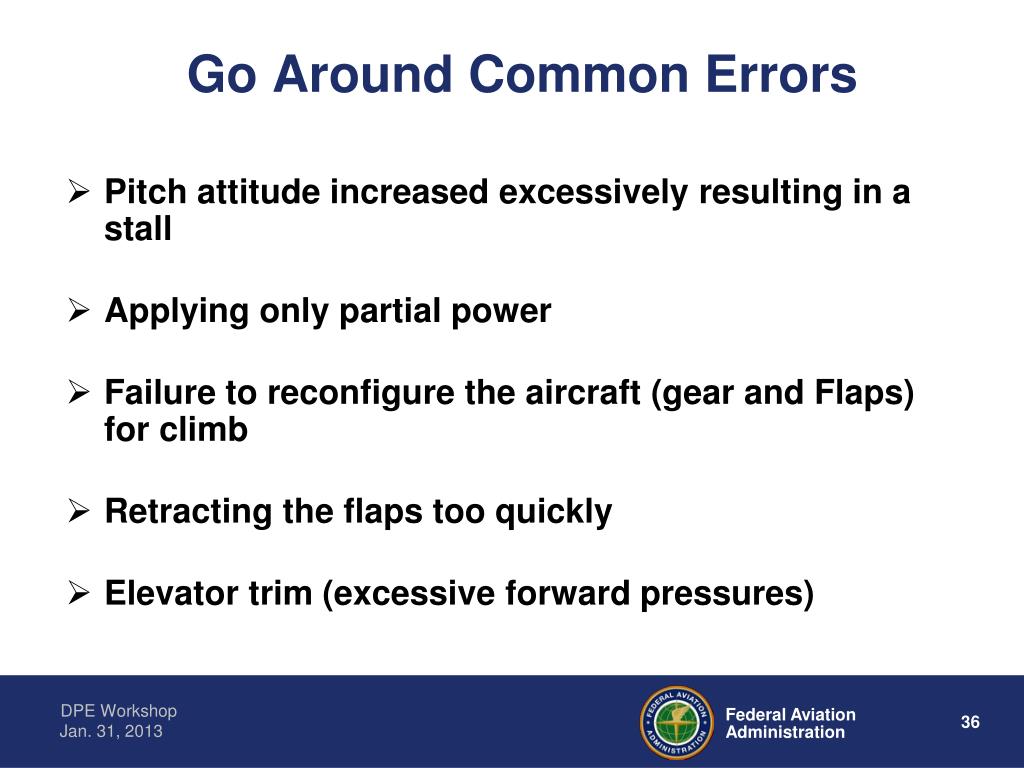 Go Around Common Errors Pitch attitude increased excessively resulting in a stall Applying only partial power Failure to reconfigure the aircraft (gear and Flaps) for climb Retracting the flaps too quickly Elevator trim (excessive forward pressures) FAA-H-8083-3A Airplane Flying Handbook