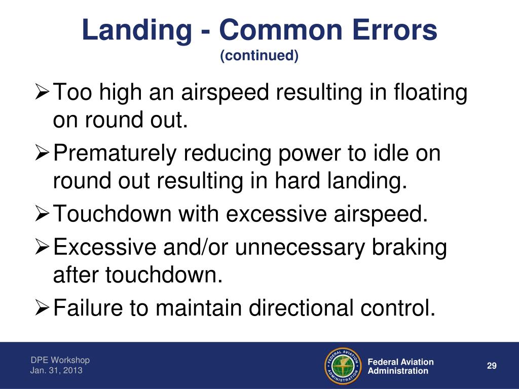 Landing - Common Errors(continued) Too high an airspeed resulting in floating on round out. Prematurely reducing power to idle on round out resulting in hard landing. Touchdown with excessive airspeed. Excessive and/or unnecessary braking after touchdown. Failure to maintain directional control. FAA-H-8083-3A Airplane Flying Handbook