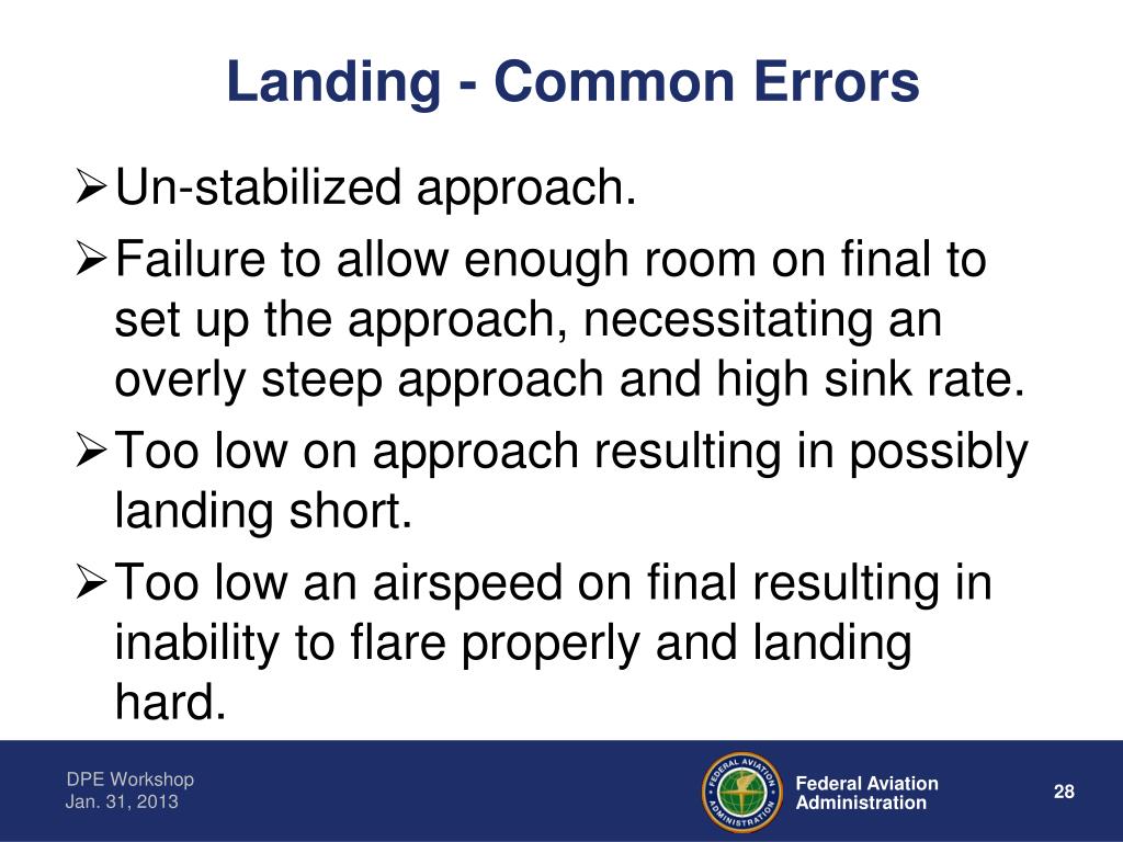 Landing - Common Errors Un-stabilized approach. Failure to allow enough room on final to set up the approach, necessitating an overly steep approach and high sink rate. Too low on approach resulting in possibly landing short. Too low an airspeed on final resulting in inability to flare properly and landing hard. FAA-H-8083-3A Airplane Flying Handbook