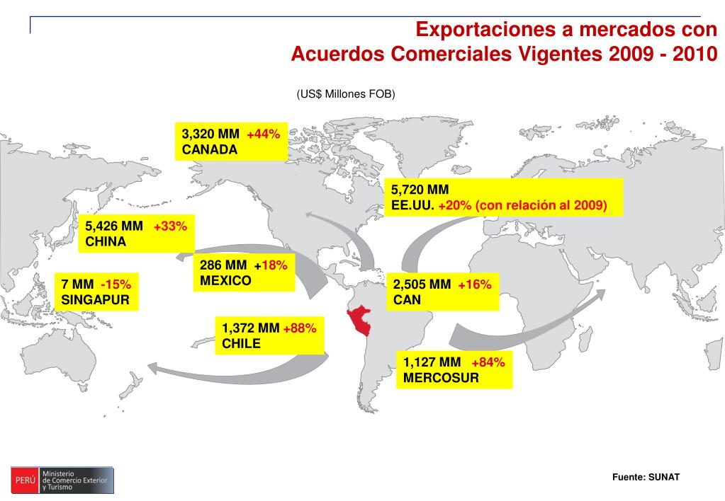 Exportaciones a mercados con Acuerdos Comerciales Vigentes 2009 - 2010 (US$ Millones FOB) 3,320 MM +44% CANADA 5,720 MM EE.UU. +20% (con relación al 2009) 5,426 MM +33% CHINA 286 MM +18% MEXICO 7 MM -15% SINGAPUR 2,505 MM +16% CAN 1,372 MM +88% CHILE 1,127 MM +84% MERCOSUR Fuente: SUNAT