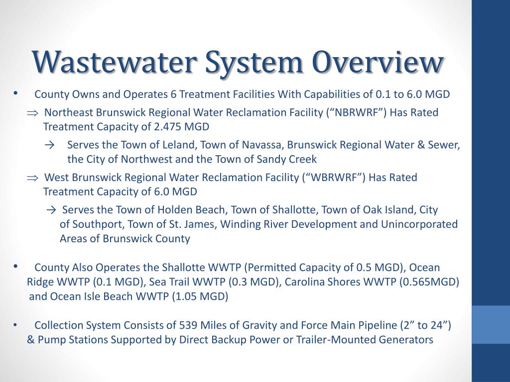 Wastewater System Overview • County Owns and Operates 6 Treatment Facilities With Capabilities of 0.1 to 6.0 MGD • Northeast Brunswick Regional Water Reclamation Facility (“NBRWRF”) Has Rated • Treatment Capacity of 2.475 MGD → Serves the Town of Leland, Town of Navassa, Brunswick Regional Water & Sewer, the City of Northwest and the Town of Sandy Creek • West Brunswick Regional Water Reclamation Facility (“WBRWRF”) Has Rated • Treatment Capacity of 6.0 MGD • →Serves the Town of Holden Beach, Town of Shallotte, Town of Oak Island, City of Southport, Town of St. James, Winding River Development and Unincorporated Areas of Brunswick County • County Also Operates the Shallotte WWTP (Permitted Capacity of 0.5 MGD), Ocean Ridge WWTP (0.1 MGD), Sea Trail WWTP (0.3 MGD), Carolina Shores WWTP (0.565MGD) and Ocean Isle Beach WWTP (1.05 MGD) • Collection System Consists of 539 Miles of Gravity and Force Main Pipeline (2” to 24”) & Pump Stations Supported by Direct Backup Power or Trailer-Mounted Generators