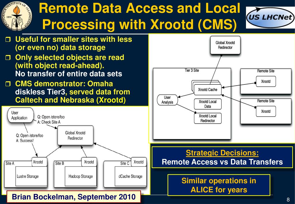 Remote Data Access and Local Processing with Xrootd (CMS) • Useful for smaller sites with less (or even no) data storage • Only selected objects are read (with object read-ahead). No transfer of entire data sets • CMS demonstrator: Omaha diskless Tier3, served data from Caltech and Nebraska (Xrootd) Strategic Decisions: Remote Access vs Data Transfers Similar operations in ALICE for years Brian Bockelman, September 2010
