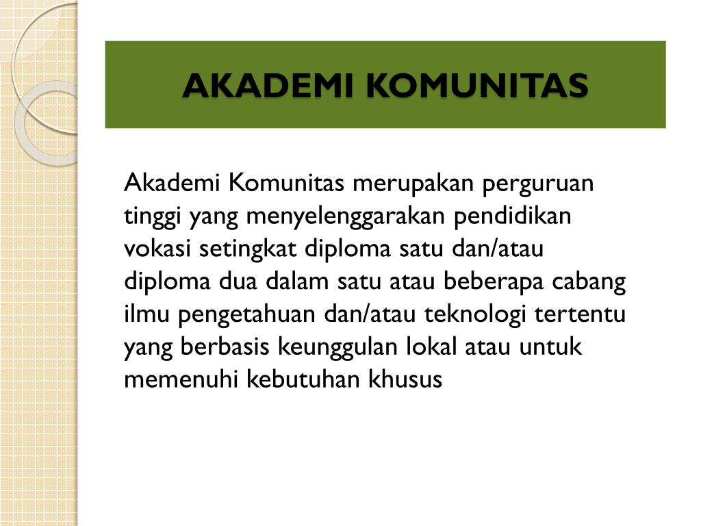 AKADEMI KOMUNITAS AkademiKomunitasmerupakanperguruantinggi yang menyelenggarakanpendidikanvokasisetingkat diploma satudan/atau diploma duadalamsatuataubeberapacabangilmupengetahuandan/atauteknologitertentu yang berbasiskeunggulanlokalatauuntukmemenuhikebutuhankhusus