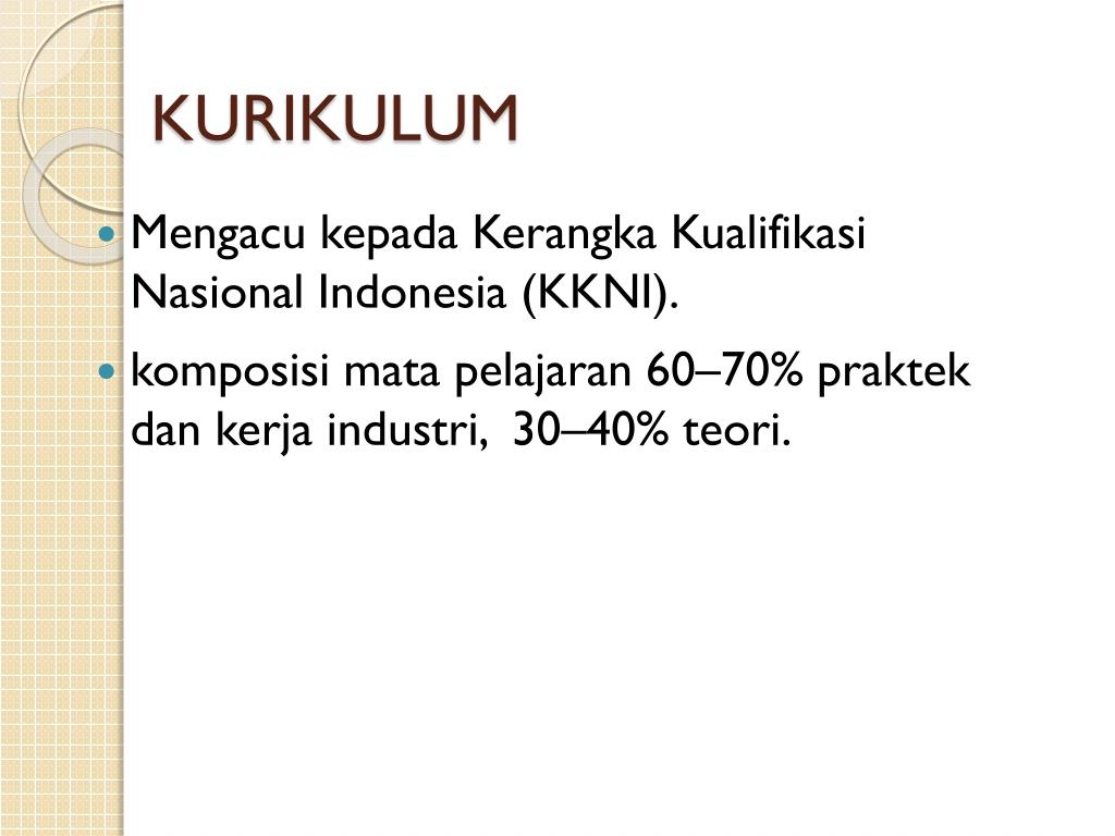 KURIKULUM • MengacukepadaKerangkaKualifikasiNasional Indonesia (KKNI). • komposisimatapelajaran 60–70% praktekdankerjaindustri, 30–40% teori.