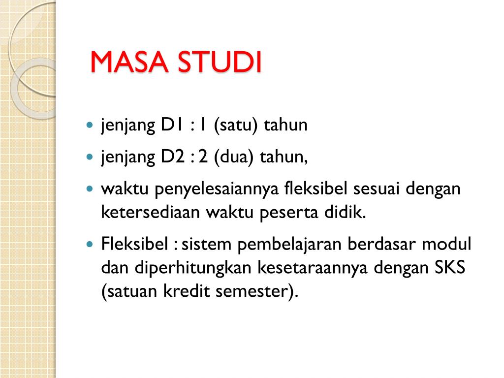 MASA STUDI • jenjangD1 : 1 (satu) tahun • jenjang D2 : 2 (dua) tahun, • waktupenyelesaiannyafleksibelsesuaidenganketersediaanwaktupesertadidik. • Fleksibel : sistempembelajaranberdasarmoduldandiperhitungkankesetaraannyadenganSKS (satuankreditsemester).