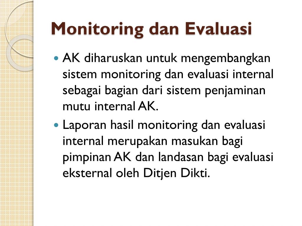 Monitoring dan Evaluasi • AK diharuskan untuk mengembangkan sistem monitoring dan evaluasi internal sebagai bagian dari sistem penjaminan mutu internal AK. • Laporan hasil monitoring dan evaluasi internal merupakan masukanbagi pimpinan AK dan landasan bagi evaluasi eksternal oleh Ditjen Dikti.