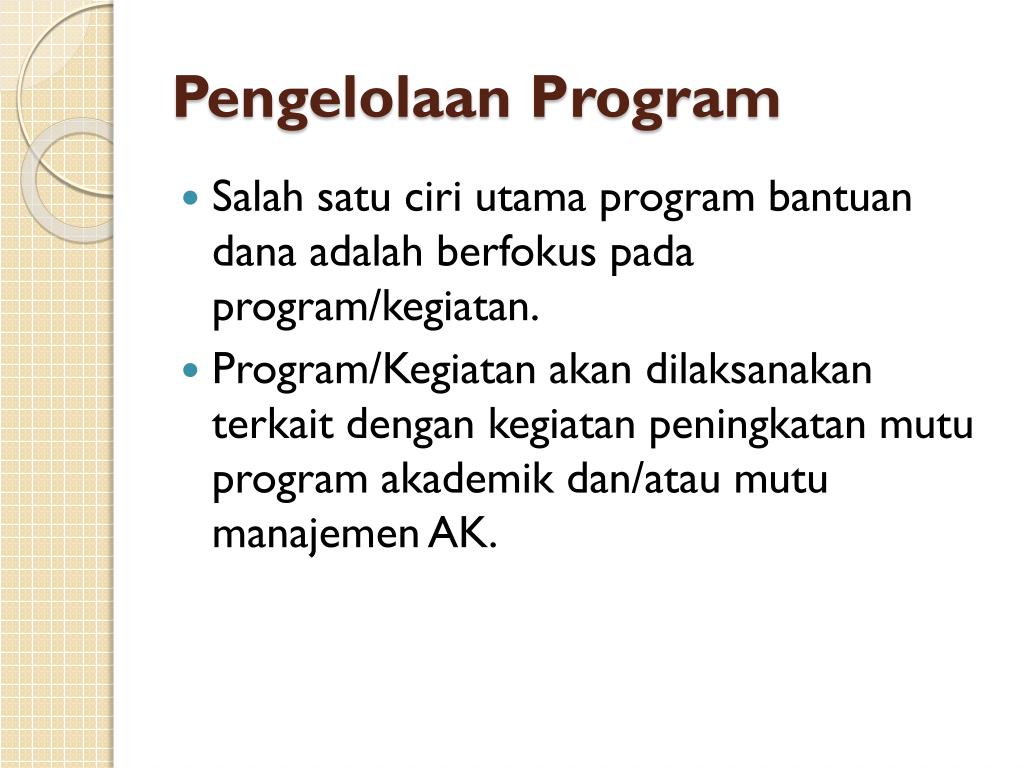 Pengelolaan Program • Salah satu ciri utama program bantuan dana adalah berfokus pada program/kegiatan. • Program/Kegiatan akan dilaksanakan terkait dengan kegiatan peningkatan mutu program akademik dan/atau mutu manajemen AK.