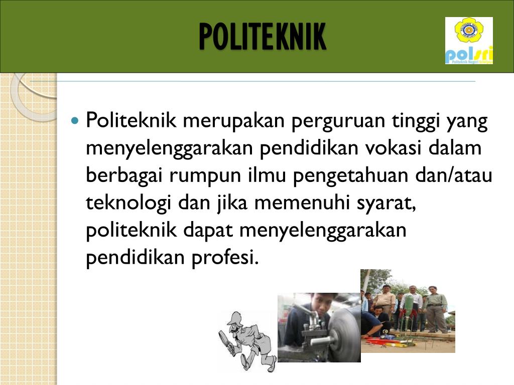 POLITEKNIK • Politeknikmerupakanperguruantinggi yang menyelenggarakanpendidikanvokasidalamberbagairumpunilmupengetahuandan/atauteknologidanjikamemenuhisyarat, politeknikdapatmenyelenggarakanpendidikanprofesi.