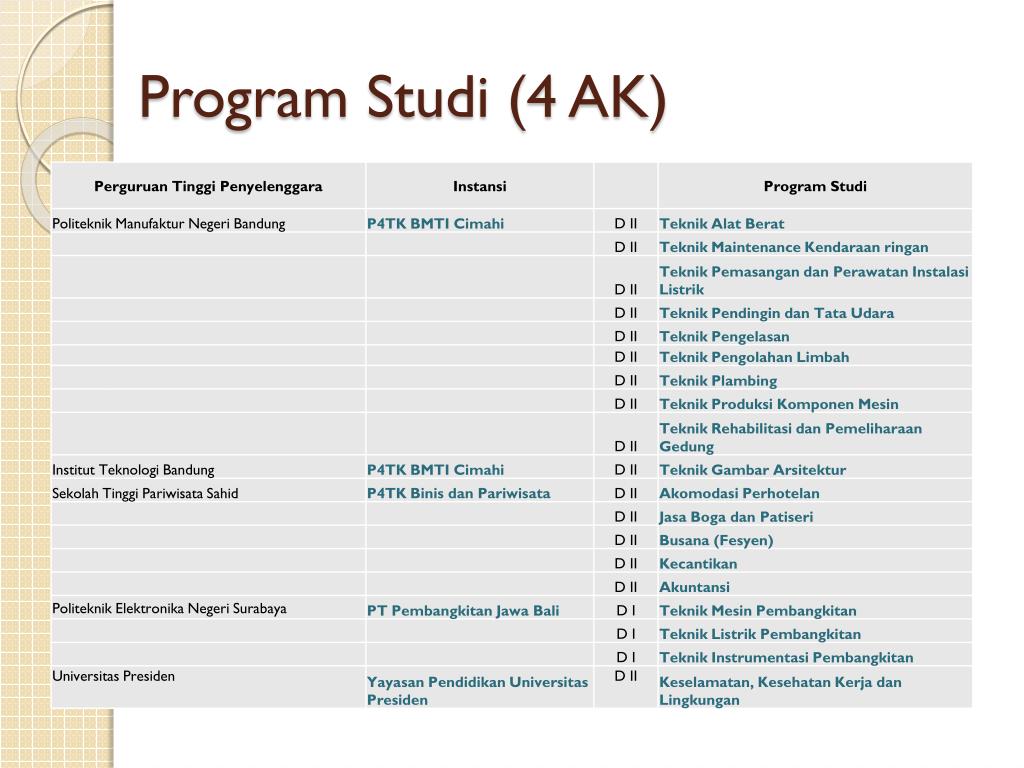 PESERTA DIDIK • Lulusanpendidikanmenengahatas(SMA, SMK, MAN atausederajat) baik yang belum maupun sudah memiliki pengalaman kerja. • Usia peserta didik pada AK tidakdibatasi
