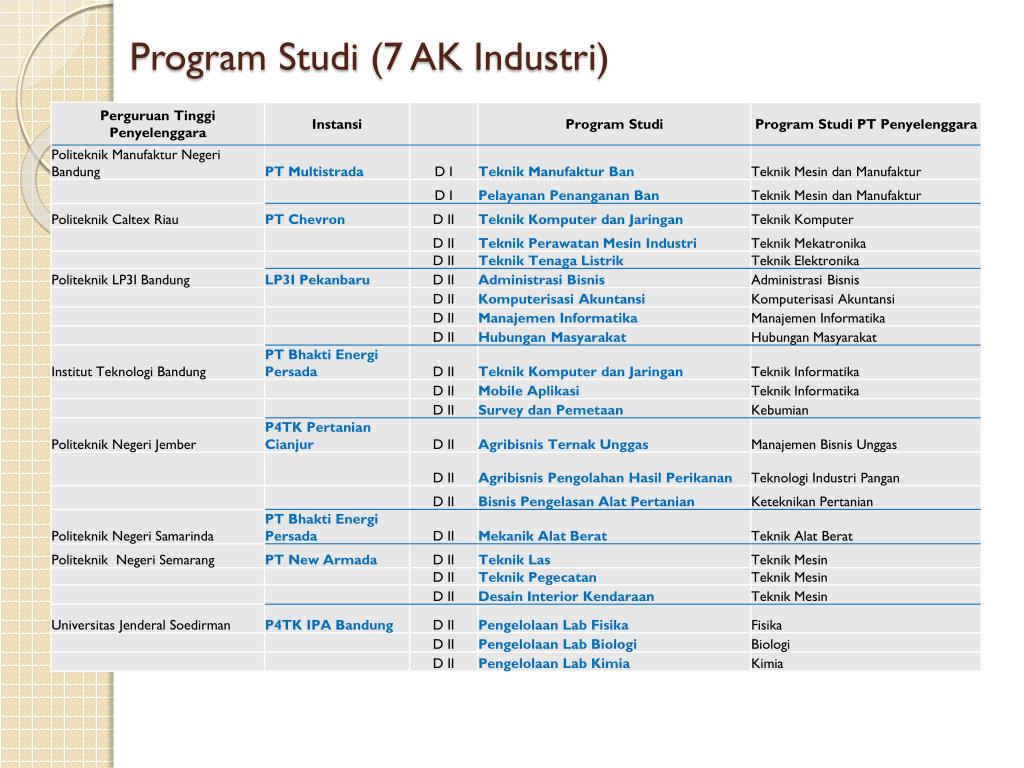 11 AK mandiri/ Industri (APBN-P) • AkademiKomunitasPresiden - Bekasi • AkademiKomunitas P4TK BMTI - Cimahi • AkademiKomunitasDuri - Bengkalis • AkademiKomunitas LP3EI - Pekanbaru • AkademiKomunitas SEDEC - Bandung • AkademiKomunitas VEDCA - Cianjur • AkademiKomunitasMultistrada - Bekasi • AkademiKomunitasKutaiTimur • AkademiKomunitas P4TK Sawangan - Bogor • AkademiKomunitas New Armada Magelang • AkademiKomunitasPembangkitanJawa Bali