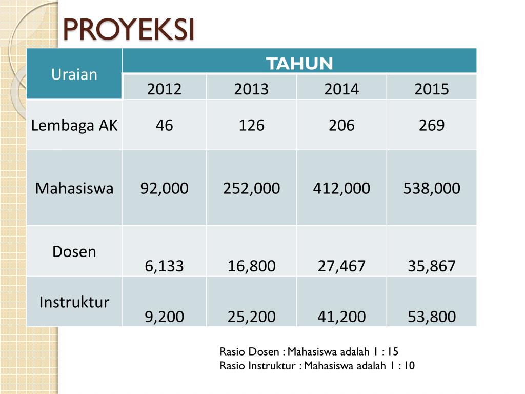 PROYEKSI Rasio Dosen : Mahasiswa adalah 1 : 15 Rasio Instruktur : Mahasiswa adalah 1 : 10