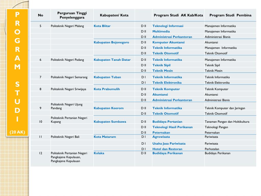 Dasarhukum • Permendiknas RInomor 20 tahun 2011 tentang penyelenggaraan program studi di luar domisili perguruan tinggi • KepmendikbudNo 161/P/2012 telahmenetapkan 12 Politekniksebagaiperguruantinggipenyelenggaraprodi di luardomisiliuntuk 20 AK kab/kota