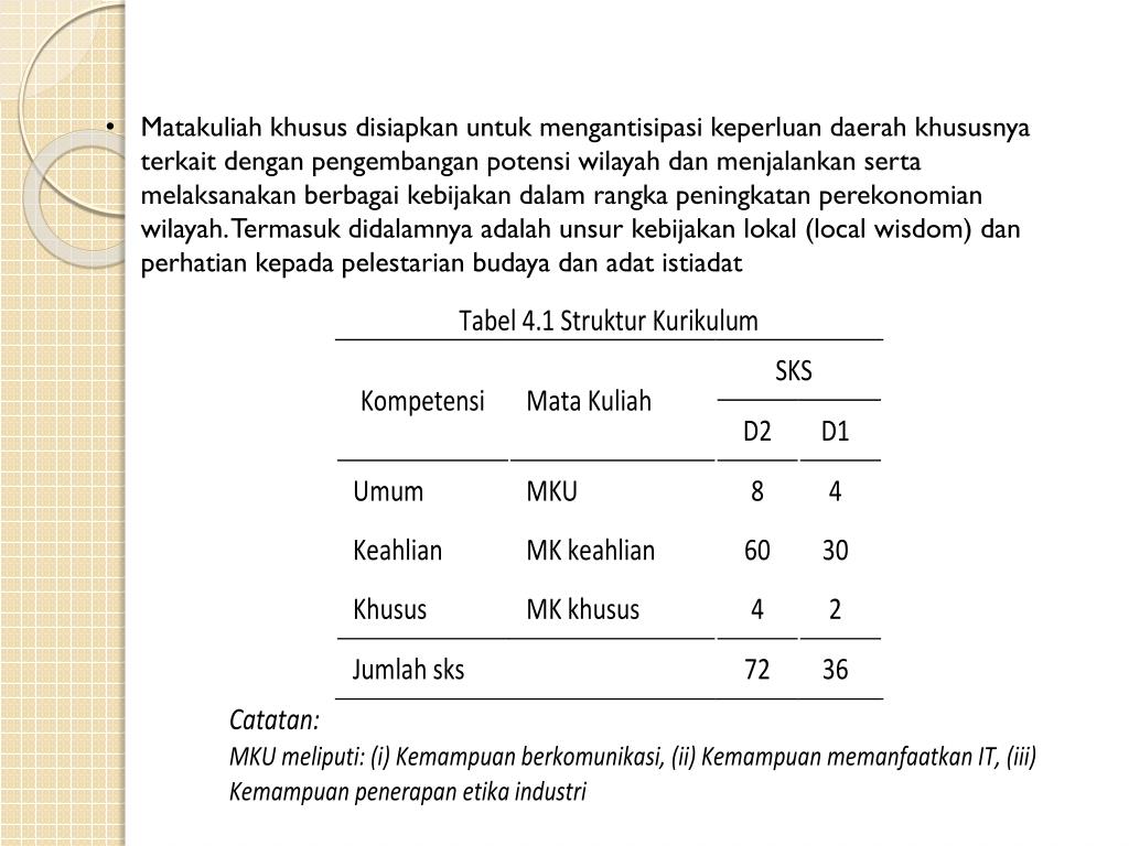 KUALIFIKASI TENAGA PENDIDIK D-2 • Lulusan diploma empatdenganpengalamanprofesionalindustri 5 tahun • Lulusan strata satudenganpengalamanprofesionalindustri 7 tahun • Lulusan SMK denganpengalamanprofesionalindustri 15 tahun • Tenagakerjaprofesionaldenganpengalamankerja minimal setaradengan level 8 (Delapan).