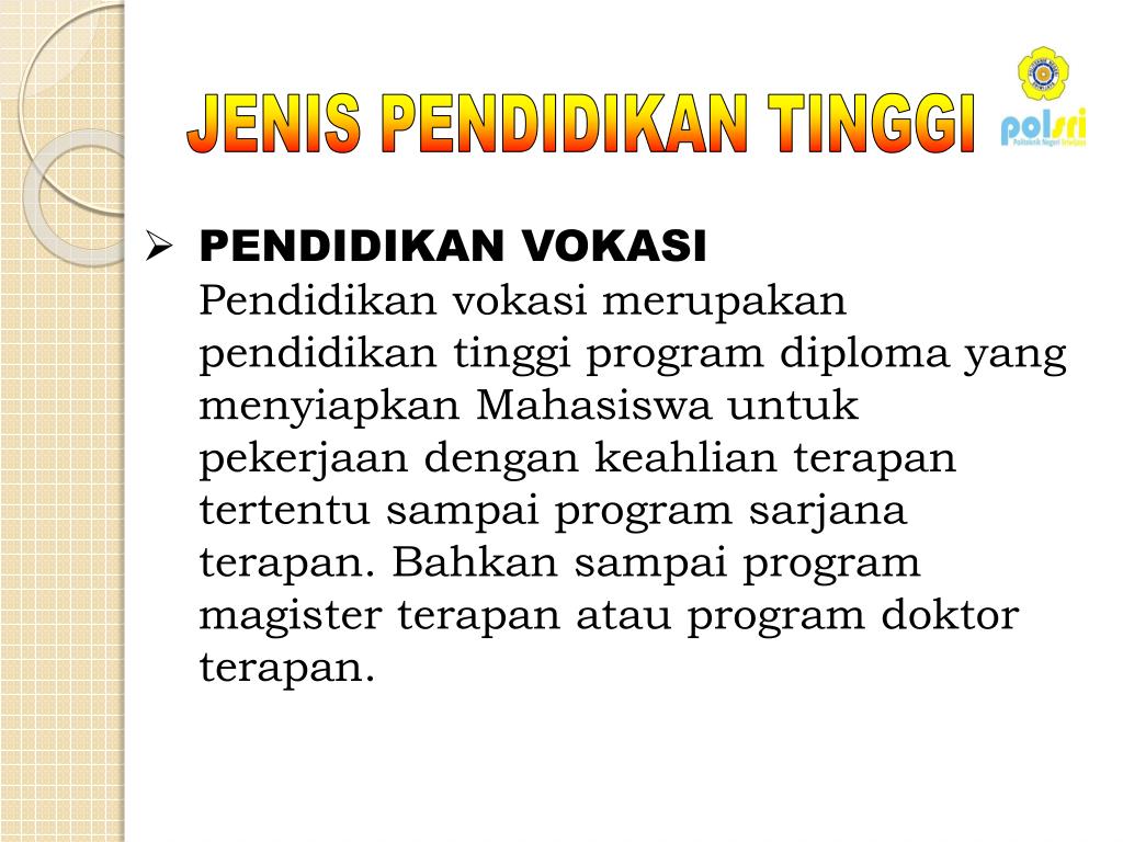 JENIS PENDIDIKAN TINGGI • PENDIDIKAN VOKASI • Pendidikanvokasimerupakanpendidikantinggi program diploma yang menyiapkanMahasiswauntukpekerjaandengankeahlianterapantertentusampai program sarjanaterapan. Bahkansampai program magister terapan atau program doktor terapan.