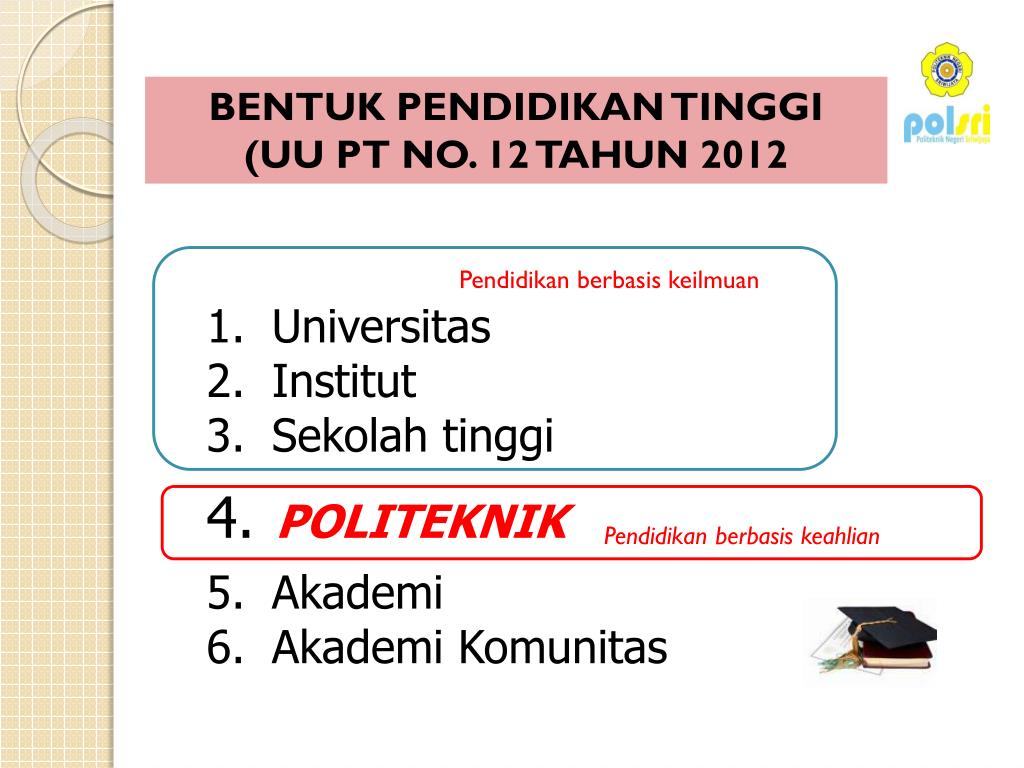 BENTUK PENDIDIKAN TINGGI (UU PT NO. 12 TAHUN 2012 Pendidikanberbasiskeilmuan • Universitas • Institut • Sekolahtinggi • POLITEKNIK • Akademi • AkademiKomunitas Pendidikanberbasiskeahlian