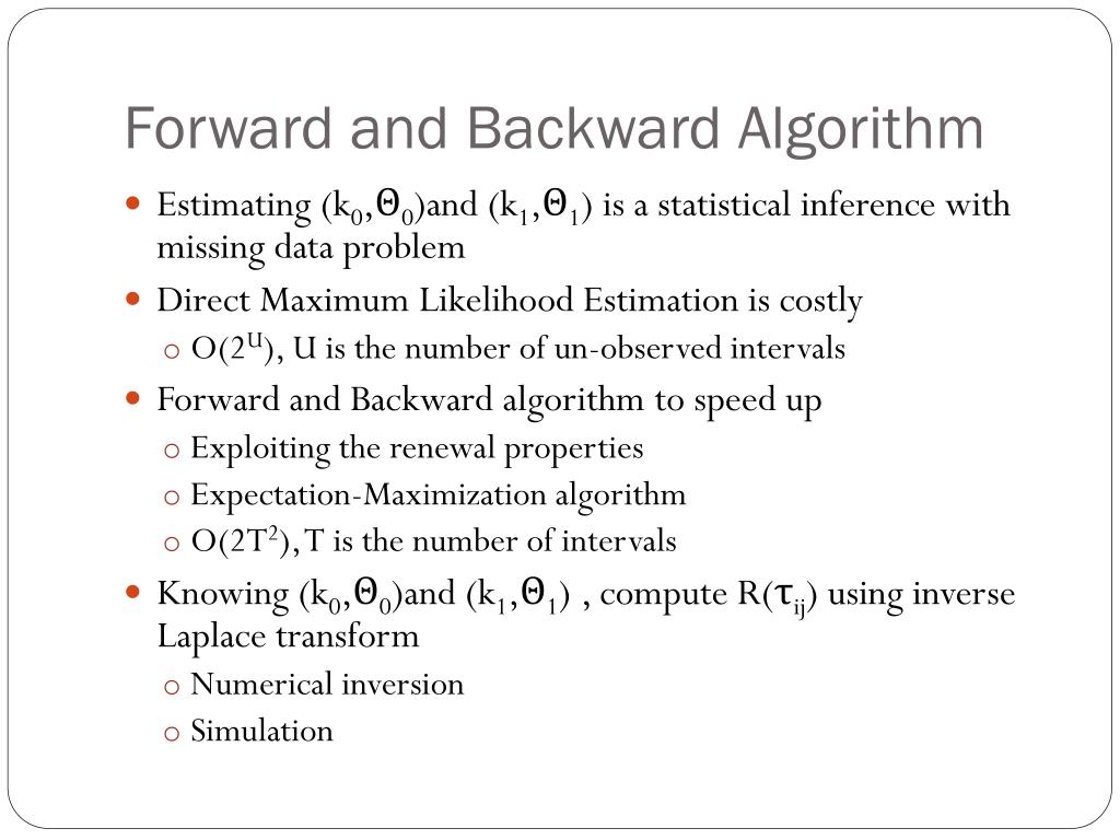 Forward and Backward Algorithm • Estimating (k0,Θ0)and (k1,Θ1) is a statistical inference with missing data problem • Direct Maximum Likelihood Estimation is costly • O(2U), U is the number of un-observed intervals • Forward and Backward algorithm to speed up • Exploiting the renewal properties • Expectation-Maximization algorithm • O(2T2), T is the number of intervals • Knowing (k0,Θ0)and (k1,Θ1) , compute R(τij) using inverse Laplace transform • Numerical inversion • Simulation