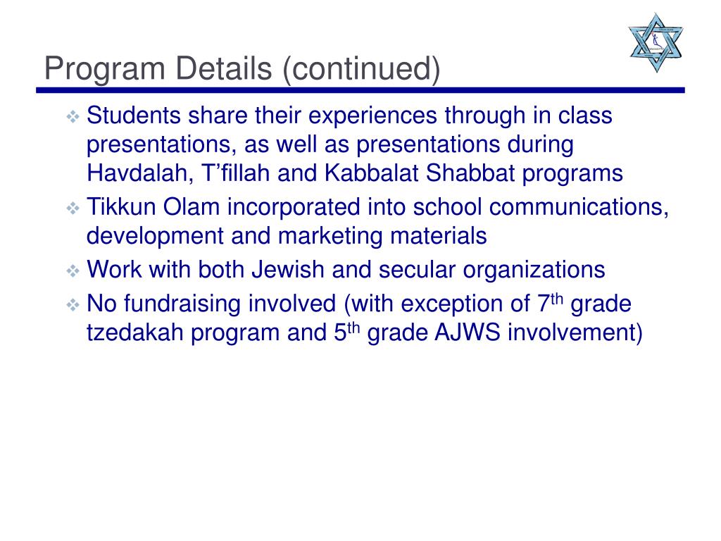 Program Details (continued) • Students share their experiences through in class presentations, as well as presentations during Havdalah, T’fillah and Kabbalat Shabbat programs • TikkunOlam incorporated into school communications, development and marketing materials • Work with both Jewish and secular organizations • No fundraising involved (with exception of 7th grade tzedakah program and 5th grade AJWS involvement)