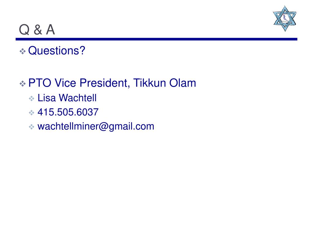 Q & A • Questions? • PTO Vice President, TikkunOlam • Lisa Wachtell • 415.505.6037 • wachtellminer@gmail.com